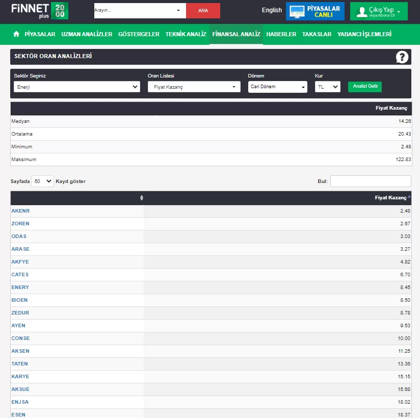 Fiyat kazanç oranına göre şirketin sektöre göre ucuz ya da pahalı olup olmadığına karar vermek için FİNNET2000 ‘de sektörel oran analizleri bölümünde sektörü seçerek analiz edebilirsiniz. Fiyat kazanç oranı sektörün ortalamasından küçük olan şirketler pahalı olarak değerlendirilir. Ayrıca listeden farklı oranları seçerek yine sektör ortalamasına göre karşılaştırmalı olarak analizler de yapılabiliyır Aşağıdaki görsel örnek amaçlı kullanılmıştır.