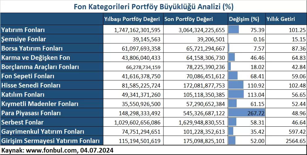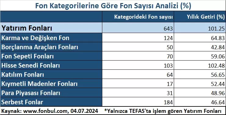 Türkiye’de özelliğine göre birçok fon bulunmaktadır. Gün geçtikçe gerekli şartların sağlanmaları dolayısıyla yeni fonlar kurulmaktadır. Gelin aşağıdaki görselde kategorilerine göre fon sayılarına ve bir yıllık getirilerine bakalım.